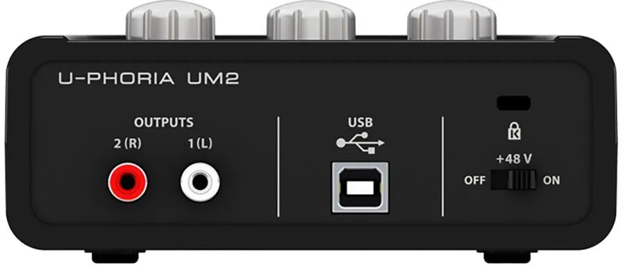 Питание аудиоинтерфейса U-Phoria UM2 происходит от USB-порта компьютера, через который производится передача данных. Корпус устройства отличается надежностью благодаря качественной прочной металлической конструкции. По словам производителя, интерфейс «построен как танк».