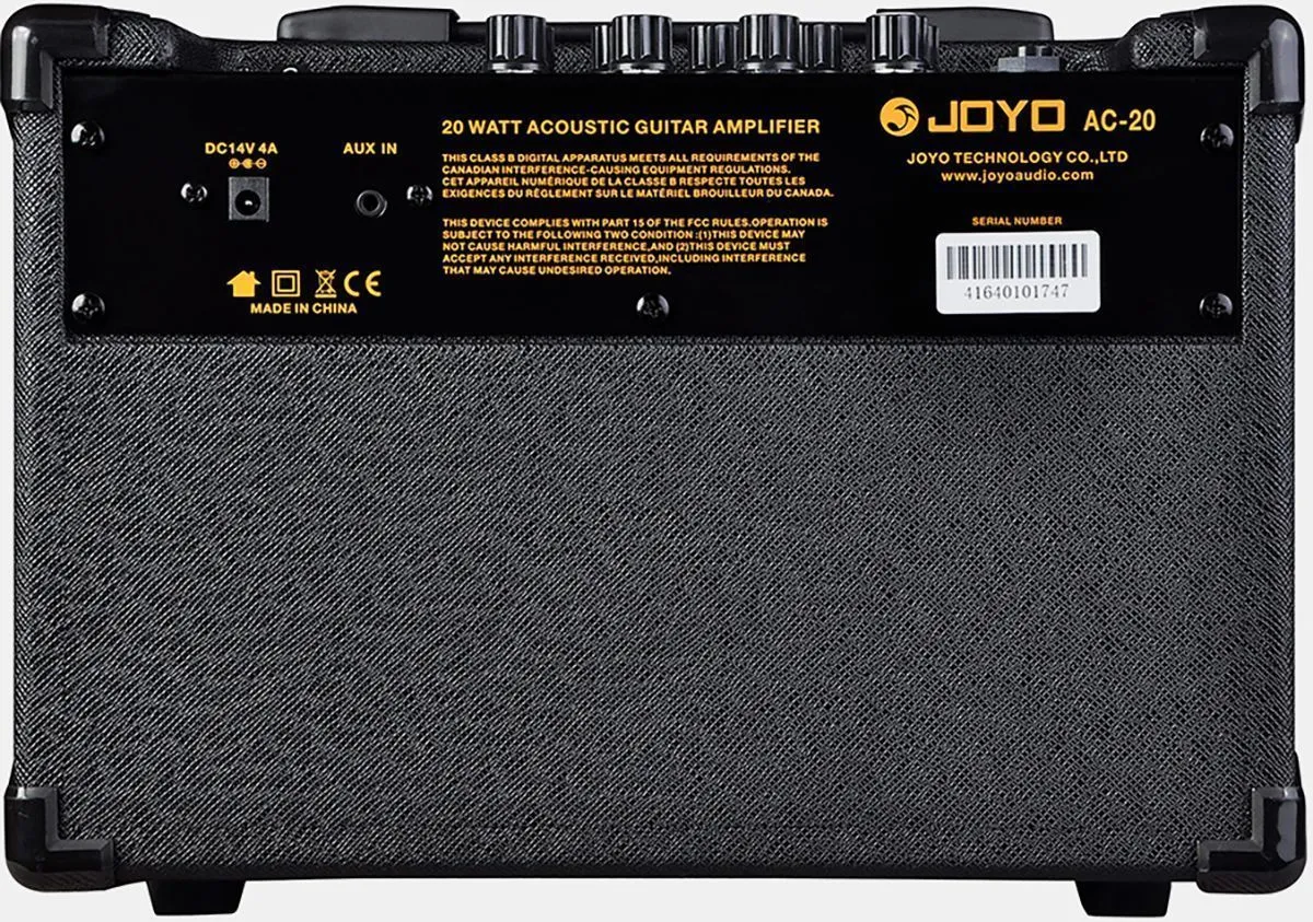 Joyo AC-20 - усилитель, разработанный со схемой усиления специально для акустических гитар, благодаря этому звук характеризуется красивымы и яркими высокими частотами с богатыми средне-низкими частотами. Мощность 20 Вт (10 Вт + 10 Вт) удовлетворит потребности для занятий дома, также её достаточно и для небольших живых выступлений. Гитарная часть AC-20 имеет 3 встроенных DSP-эффекта: Chorus, Delay и Reverb. Все эффекты могут использоваться одновременно.