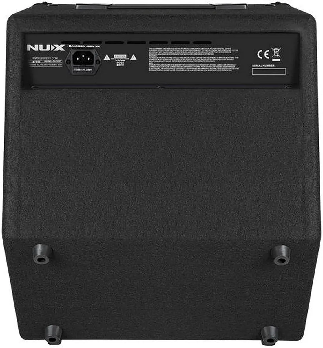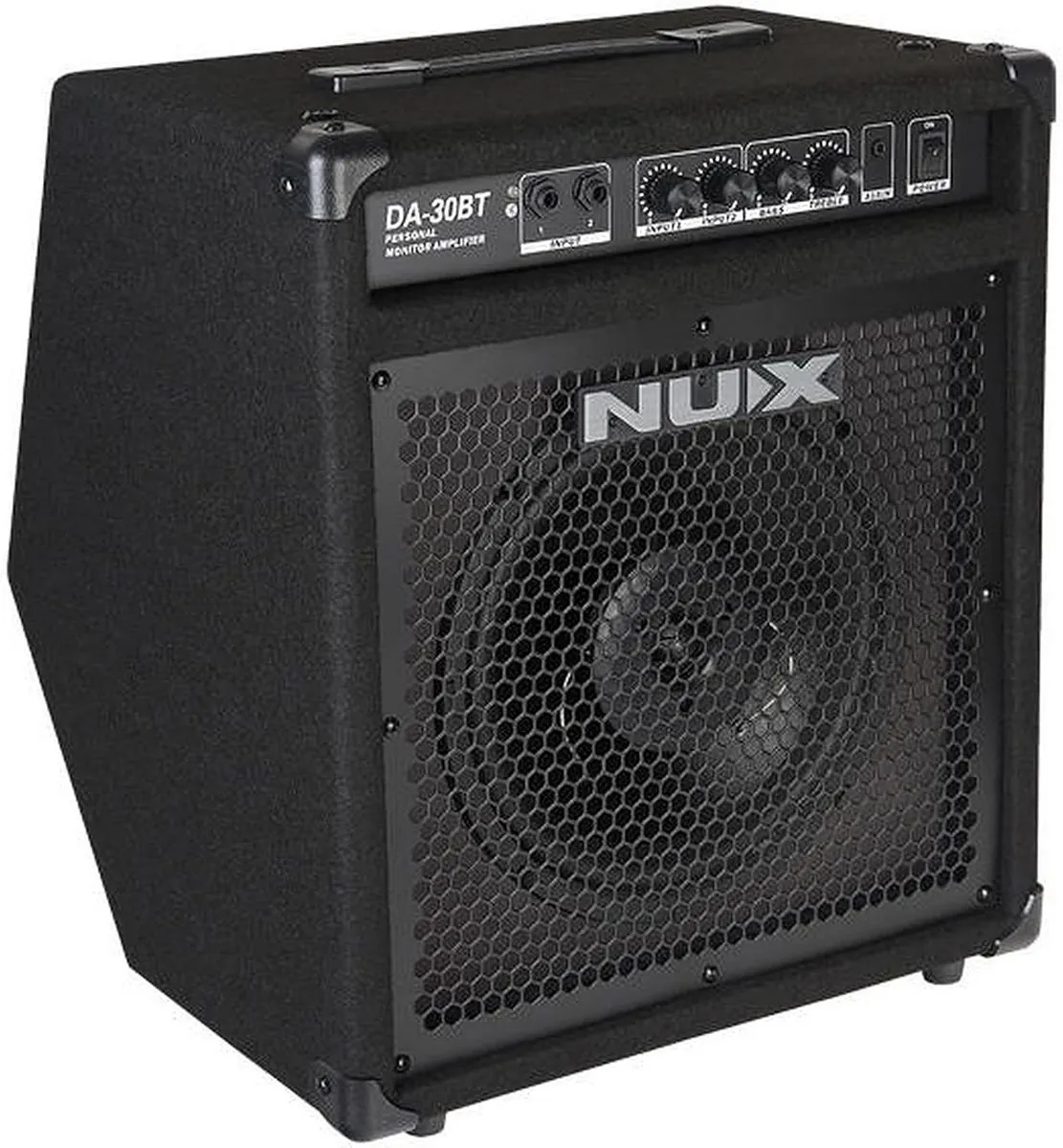 NUX DA-30BT оснащен усилителем мощности 30 Вт, и 10" широкополосным динамиком. Частотная характеристика отлично подходит для разнообразных ударных инструментов, яркие высокие частоты, насыщенный бас. Двухполосный эквалайзер позволяет настроить звучание. DA-30BT оснащен Bluetooth подключением, что позволяет музыканту проще играть свои песни с усилителем.