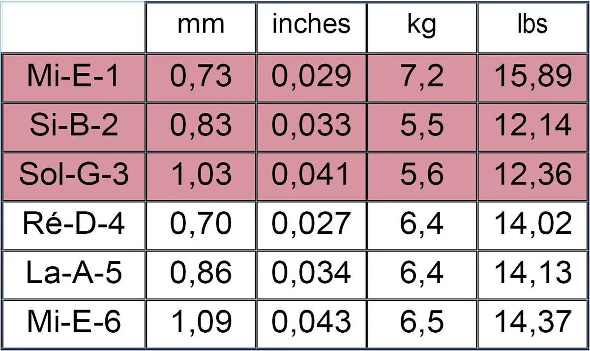 Традиционные толщины струн.
